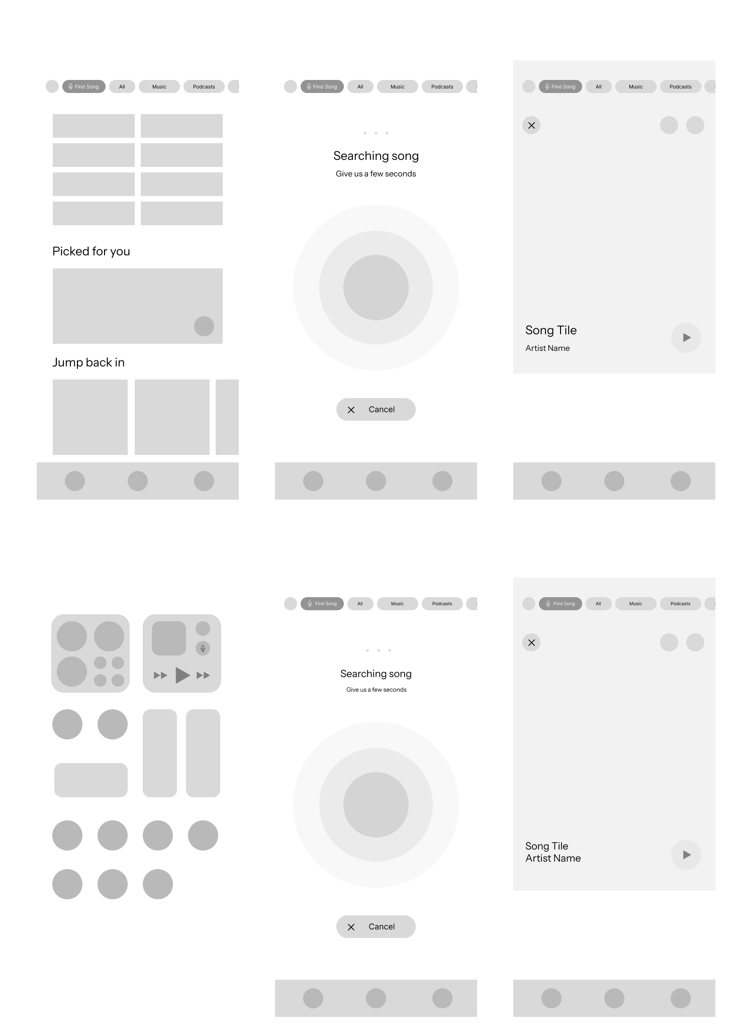 Using insights from user research and interviews, I created low-fidelity wireframes to visualize the proposed song recognition feature and explore how it could be seamlessly integrated into Spotify’s interface.